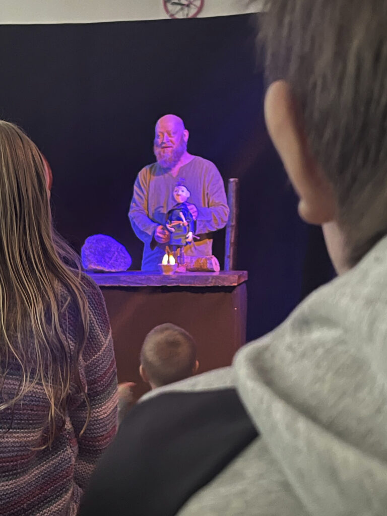 Fredag fik vi besøg af Jakob (ikke vores pædagog Jakob), men skuespilleren Jakob, som brugte hele formiddagen på at stille sit teater op. Klokken 12 havde vi fornøjelsen af et helt igennem fantastisk, rørende, utroligt grafisk smukt og velspillet stykke. En rejse til jernalderen med slaveri, kærlighed og fortællingen om at finde hjem – sikke en oplevelse. Når alle børn sidder bomstille gennem hele stykket, ved vi bare, at det er godt!
