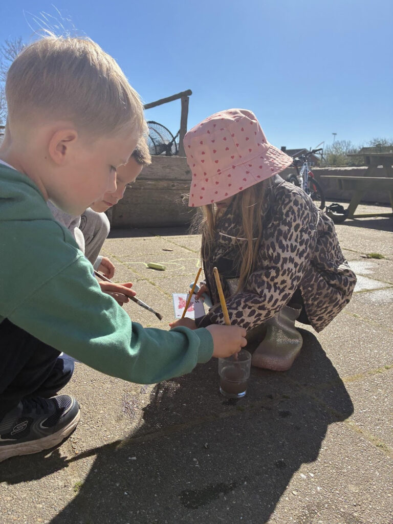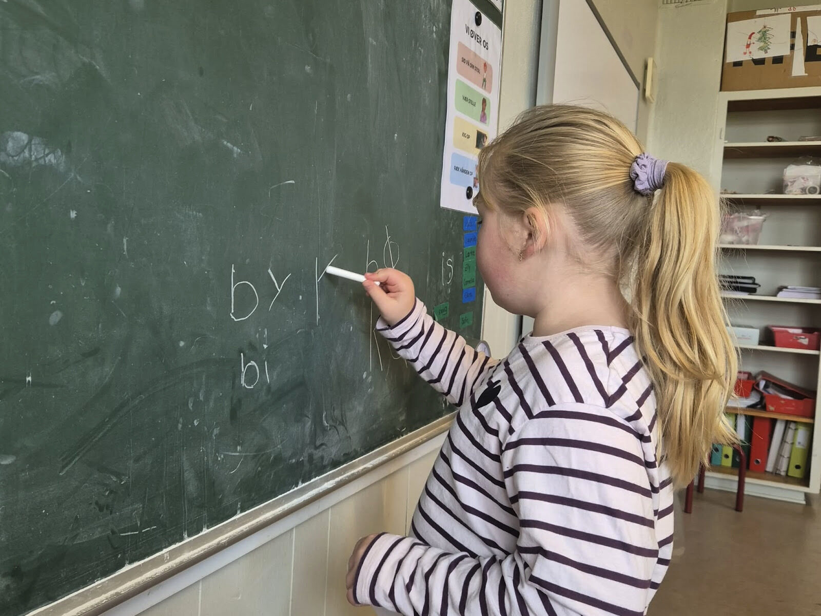 Vi har nydt det gode vejr, og lavet opgaver udenfor. I dag har vi skrevet små ord med vand, kridt og i sand – det var sjovt.